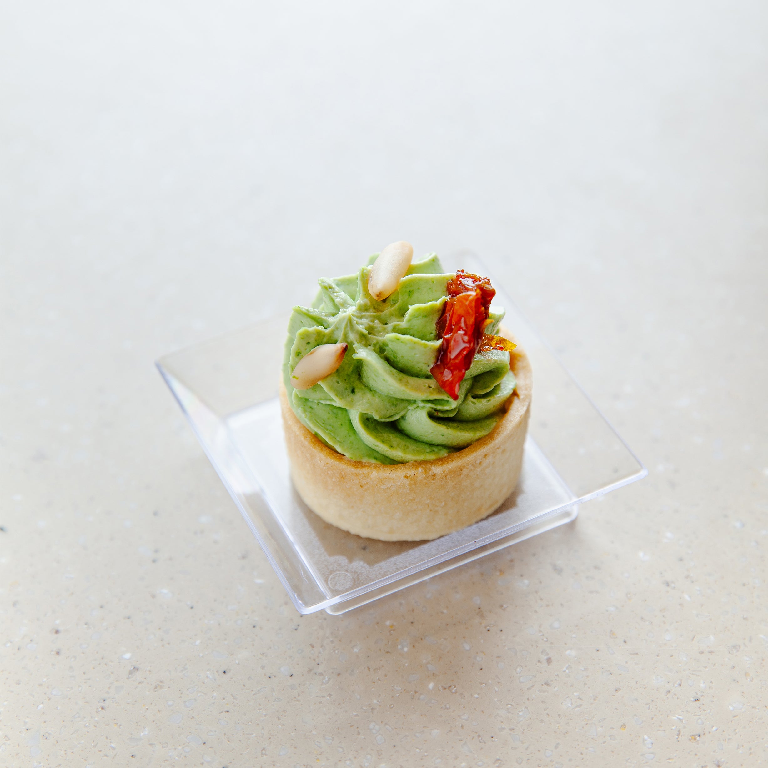 Golden tart filled with creamy pesto-infused cheese, sun-dried tomato, red onion, and toasted pine nuts