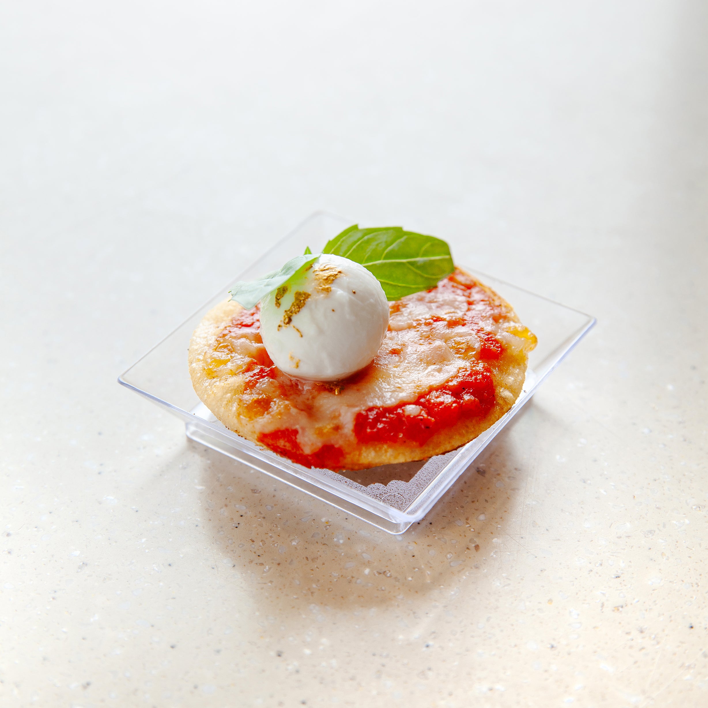 Crispy mini pizza topped with melted mozzarella, Parmesan, earthy white mushrooms, and a rich tomato base