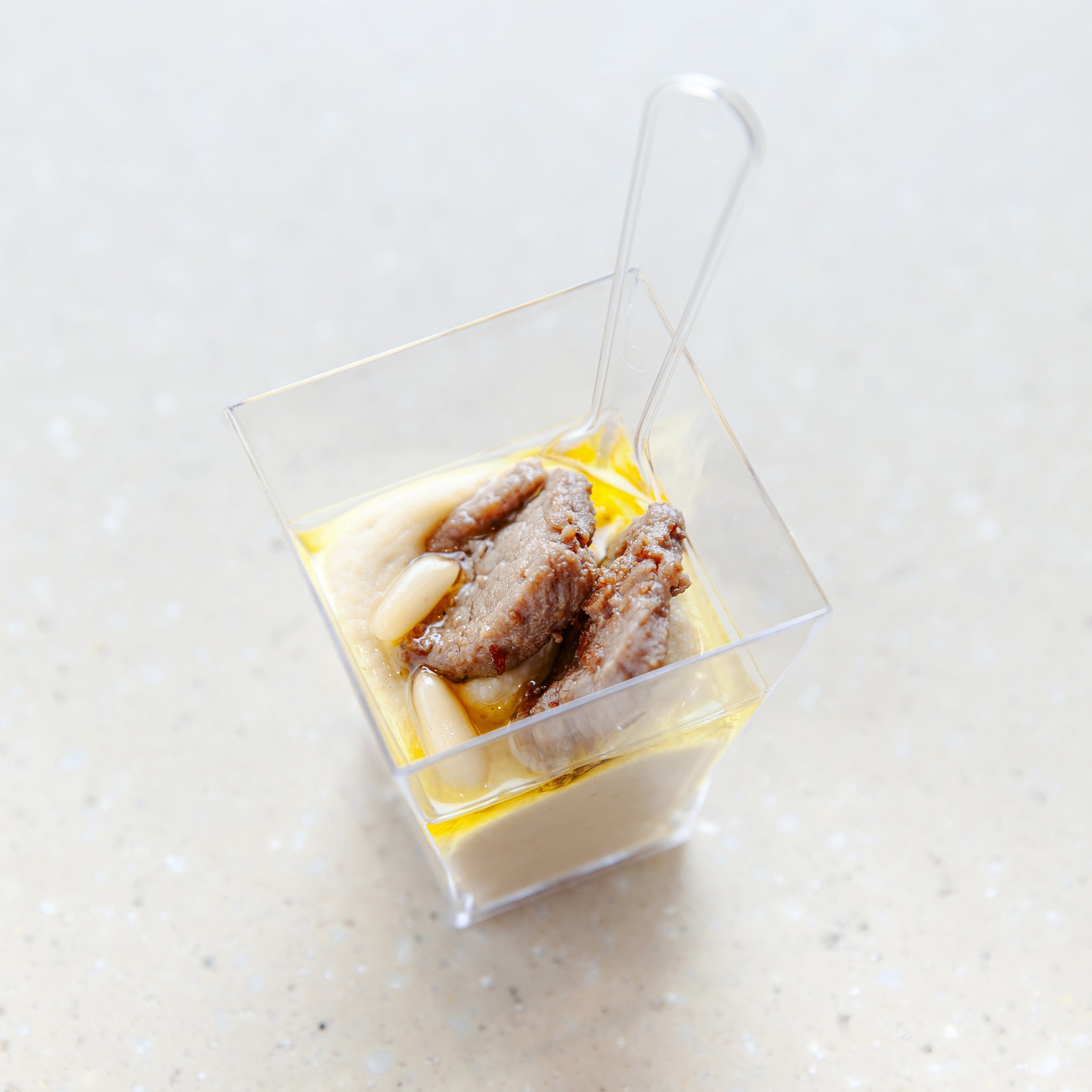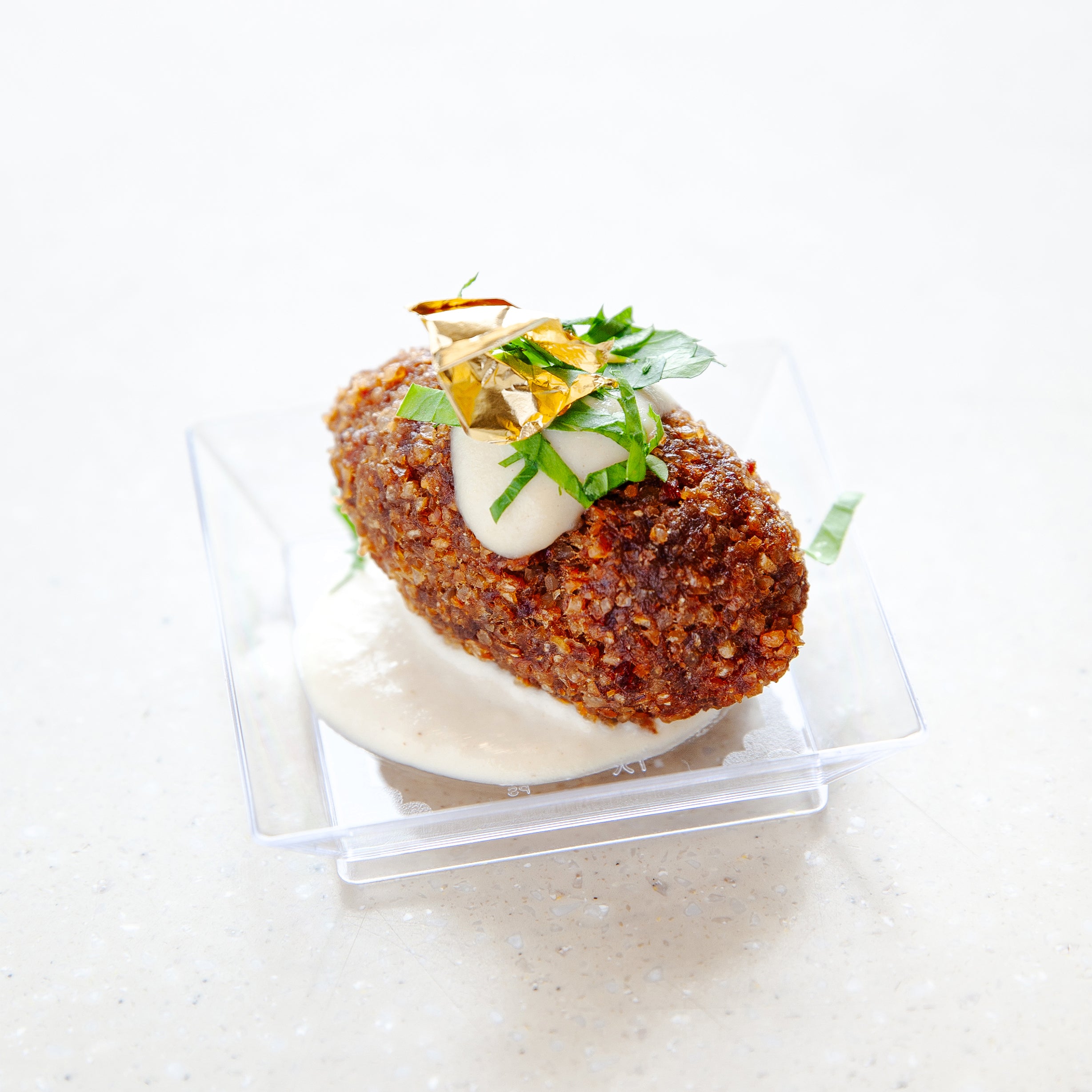 Crispy mini kibbeh filled with minced wagyu beef, served with creamy tahini sauce, tangy pomegranate molasses, and a sprinkle of pine nuts.