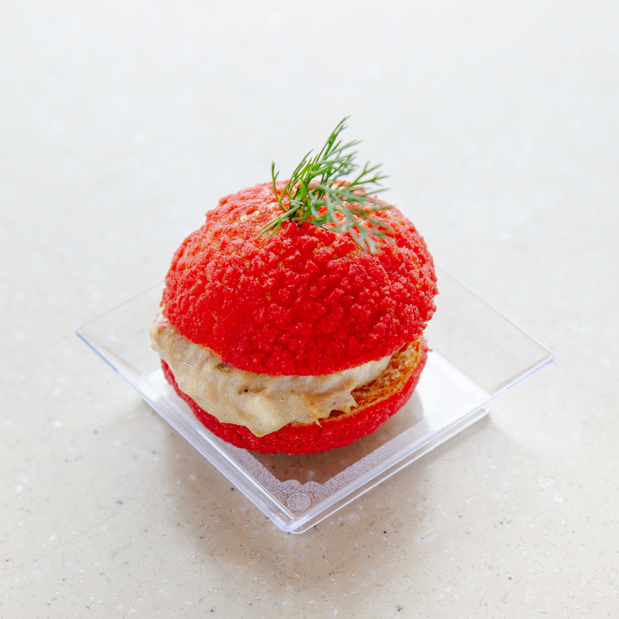 Buttery éclair filled with tangy tuna, red onion, capers, pickles, and a creamy mustard-mayonnaise mix, finished with fresh chives